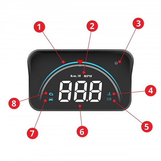 Head Up Display: glavna funkcija je prikaz informacij na armaturni plošči avtomobila (npr. hitrost, vrtljaji, temperatura vode, napetost, potovalna razdalja itd.) voznik vedno lahko gleda le na cesto in se izogne nevarnemu spuščanju glave navzdol.