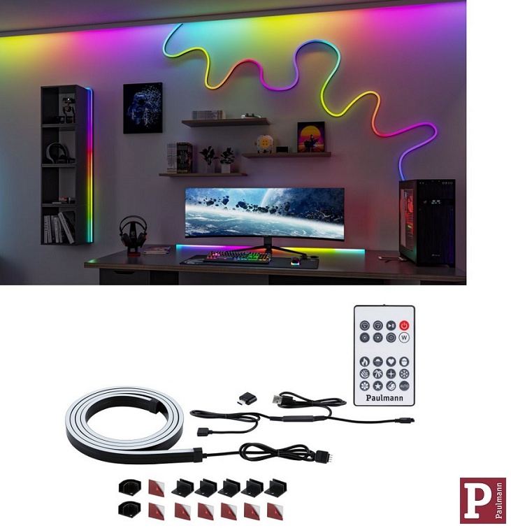Set neon flexa, elementov za pritrditev, RGB krmilnika in adapterja.